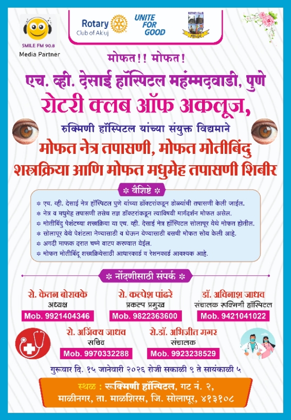 Rotary Club Akluj Organised Free eye check up camp and Free Catrack surgery camp